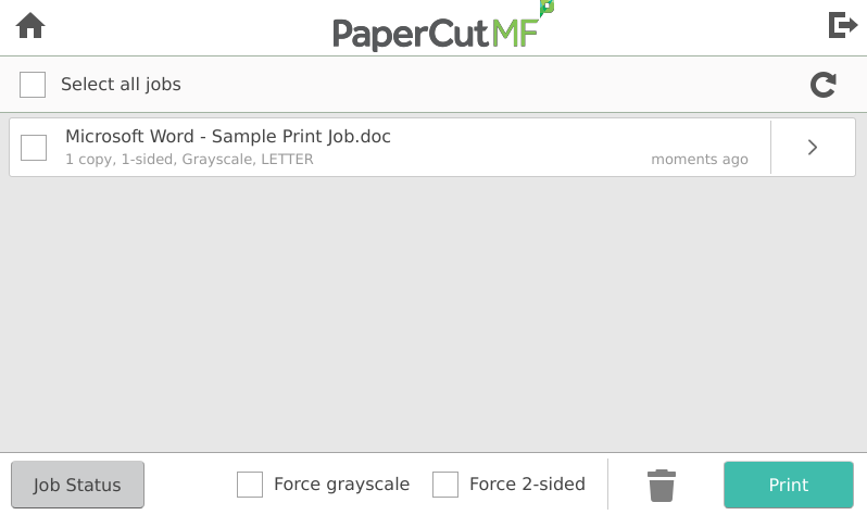 En ny skärm öppnas och dina väntande utskrifter visas. Här bockar du i det du vill skriva ut. Efter att du bockat i utskrifter så kan du tvinga de att skrivas ut i gråskala eller som dubbelsidigt, även om du inte valde dessa inställningar tidigare. Du kan också ta bort valda utskrifter med papperskorgsikonen. Valda utskrifter skrivs ut när du trycker på knappen Utskrift. Det finns en jobbstatusknapp för att kontrollera statusen för utskriftsjobben på skrivaren.