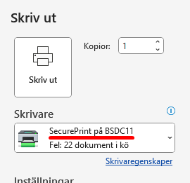 För att dina utskrifter ska hamna i utskriftskön så är det viktigt att du väljer rätt skrivare. Välj skrivaren SecurePrint på din dator.